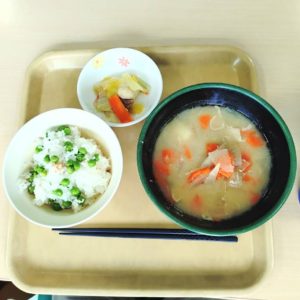 先日の昼食では手作りの豚汁とグリーンピースのご飯🍚でした。