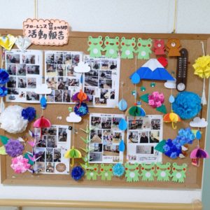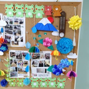 今月の飾りは紫陽花と可愛い傘と蛙です。