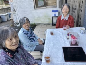 本日は近くの神社へお散歩へ行き、施設の前でティータイムの時間を過ごしました😊
